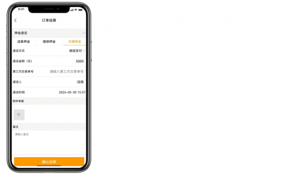 在接收到車管人員檢查完成的提醒后,小李迅速在線完成租金、手續(xù)費(fèi)、服務(wù)費(fèi)、過(guò)路費(fèi)等各項(xiàng)費(fèi)用的信息錄入,并啟動(dòng)了一鍵結(jié)算審核流程。待管理者審核無(wú)誤通過(guò)后,小李即可向客戶進(jìn)行結(jié)算操作。